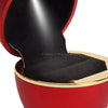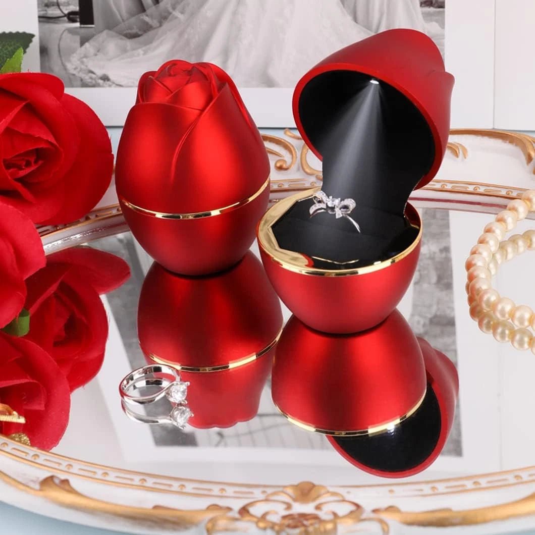 Sorprende con una presentación única y elegante. Esta caja en forma de rosa, con acabado rojo brillante y detalles dorados, cuenta con una luz LED interior que ilumina la joya al abrirse, creando un efecto mágico e inolvidable.