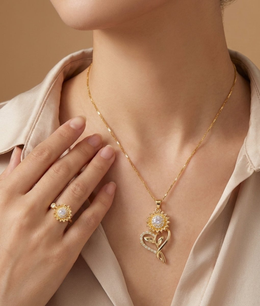 Girasol Heart Duo™ Anillo y Collar antiestrés de girasol giratorio bañado en oro 14k - Podios