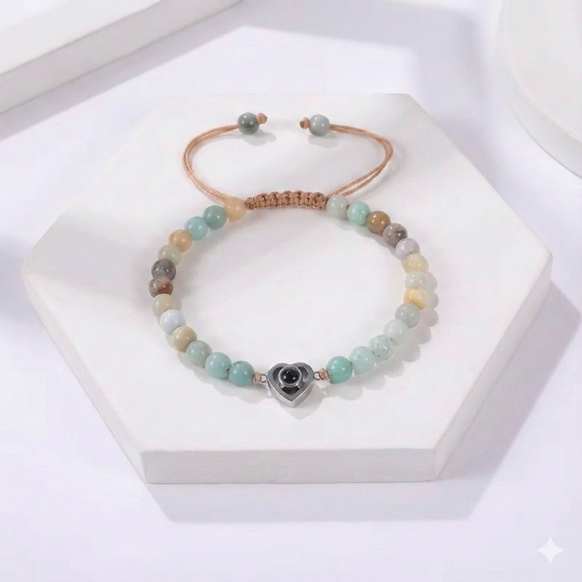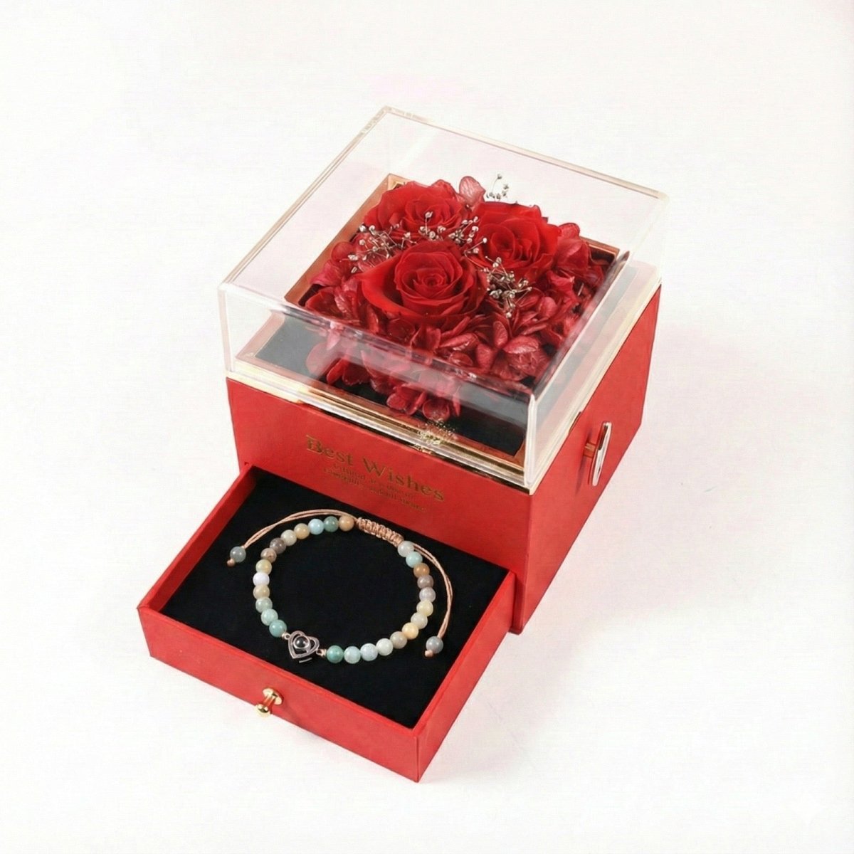 Un regalo único y elegante que combina una pulsera de piedra natural con un pequeño corazón proyectable que contiene el mensaje “Te amo” en 100 idiomas. Acompañada de una espectacular caja musical con rosas preservadas, este set está creado para sorprender desde el primer instante.