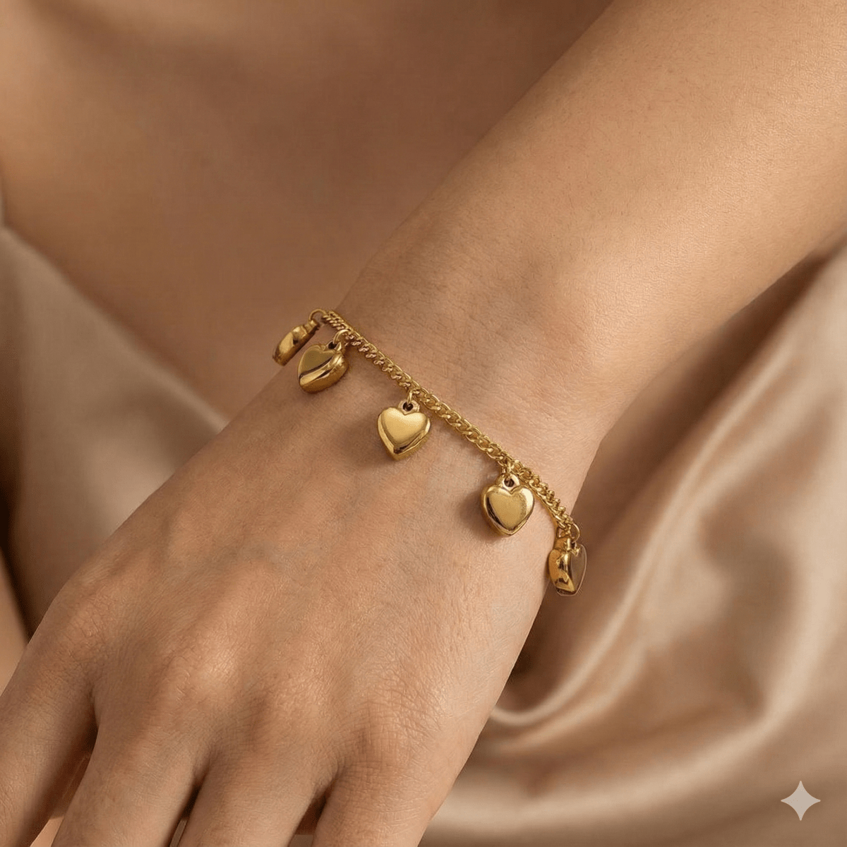 La Pulsera Heart Charm captura la esencia del amor y la ternura con un diseño elegante y atemporal. Sus dijes de corazón sobre una fina cadena bañada en oro 14K aportan brillo y movimiento a cada gesto.