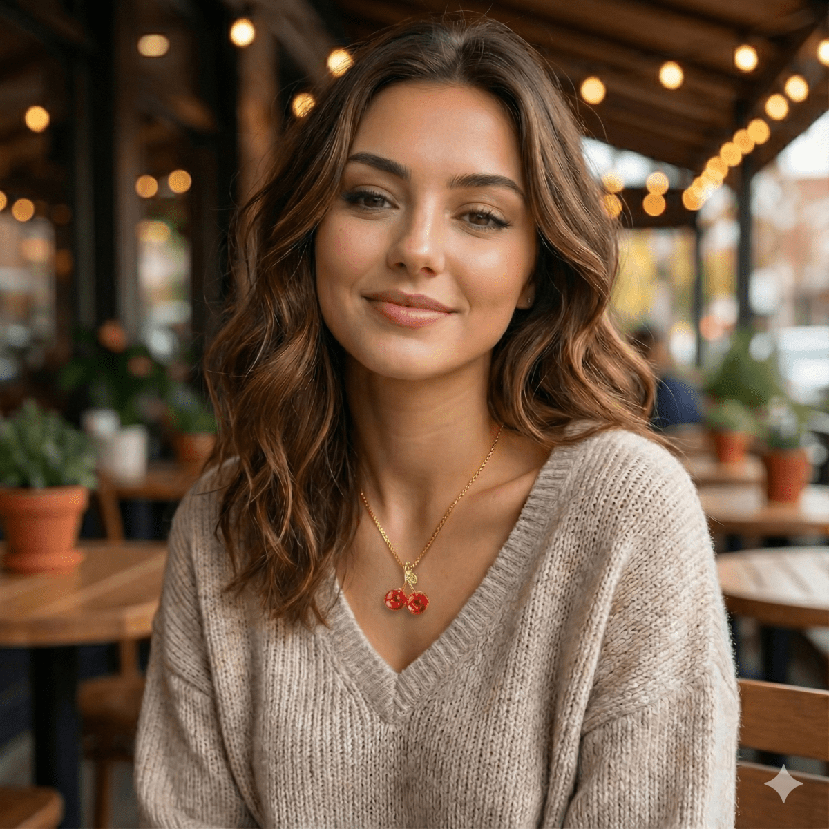 Un toque de diseño coqueto y romántico para quienes aman los detalles dulces. Este collar enchapado en oro 14k destaca por su dije de cerezas rojas con hoja brillante, ideal para regalar y sorprender.