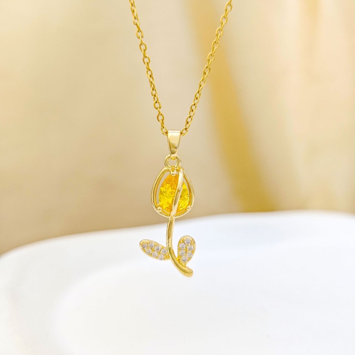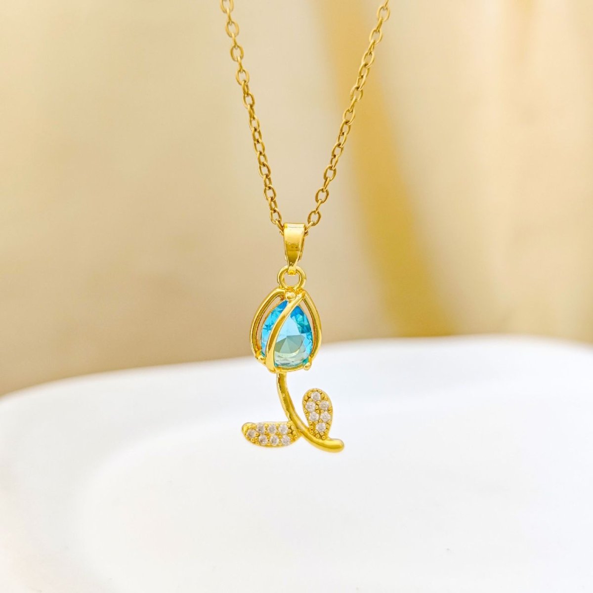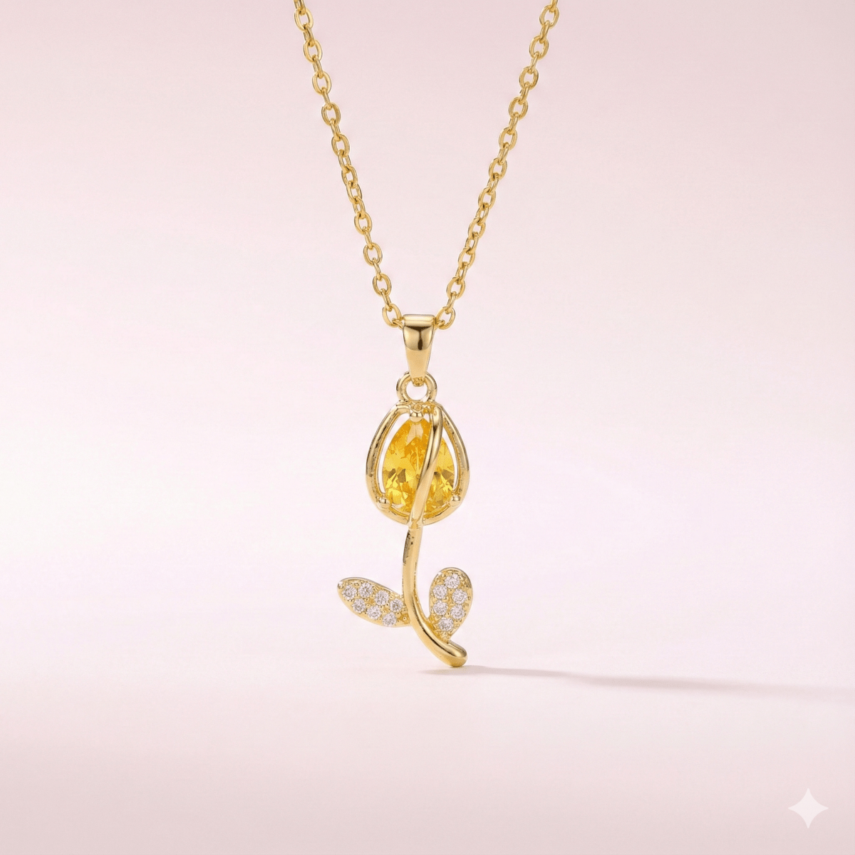 Este elegante collar con dije de tulipán rojo simboliza el amor sincero y la belleza interior. Su diseño combina el brillo de los cristales rojos con el resplandor del oro 14k, creando una joya única para sorprender a esa mujer especial.